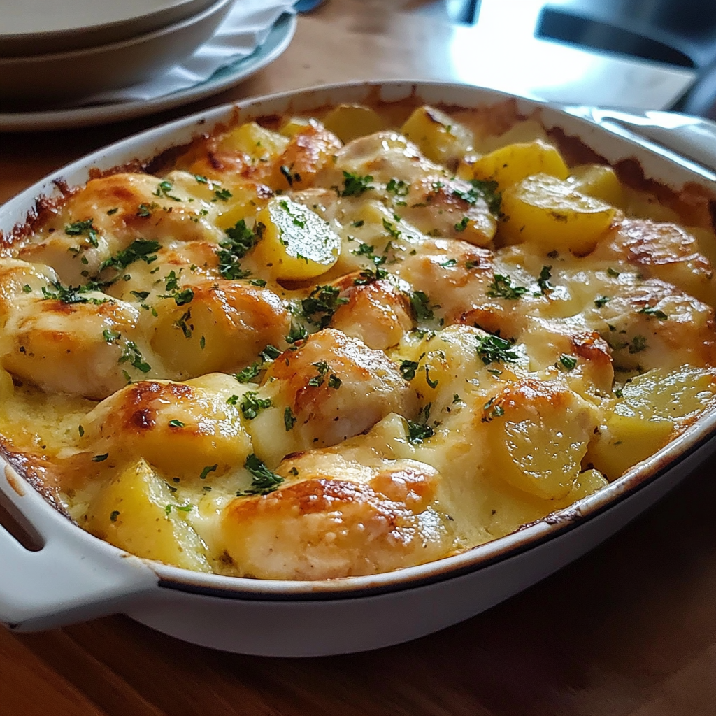 What makes this dish truly special is the perfect balance of textures and flavors. The potatoes soak up all the delicious seasonings and juices from the chicken, while the melty cheese binds everything together into one decadent, creamy bite. The dish is baked to golden perfection, with a crispy cheese crust on top that will have you coming back for seconds.
